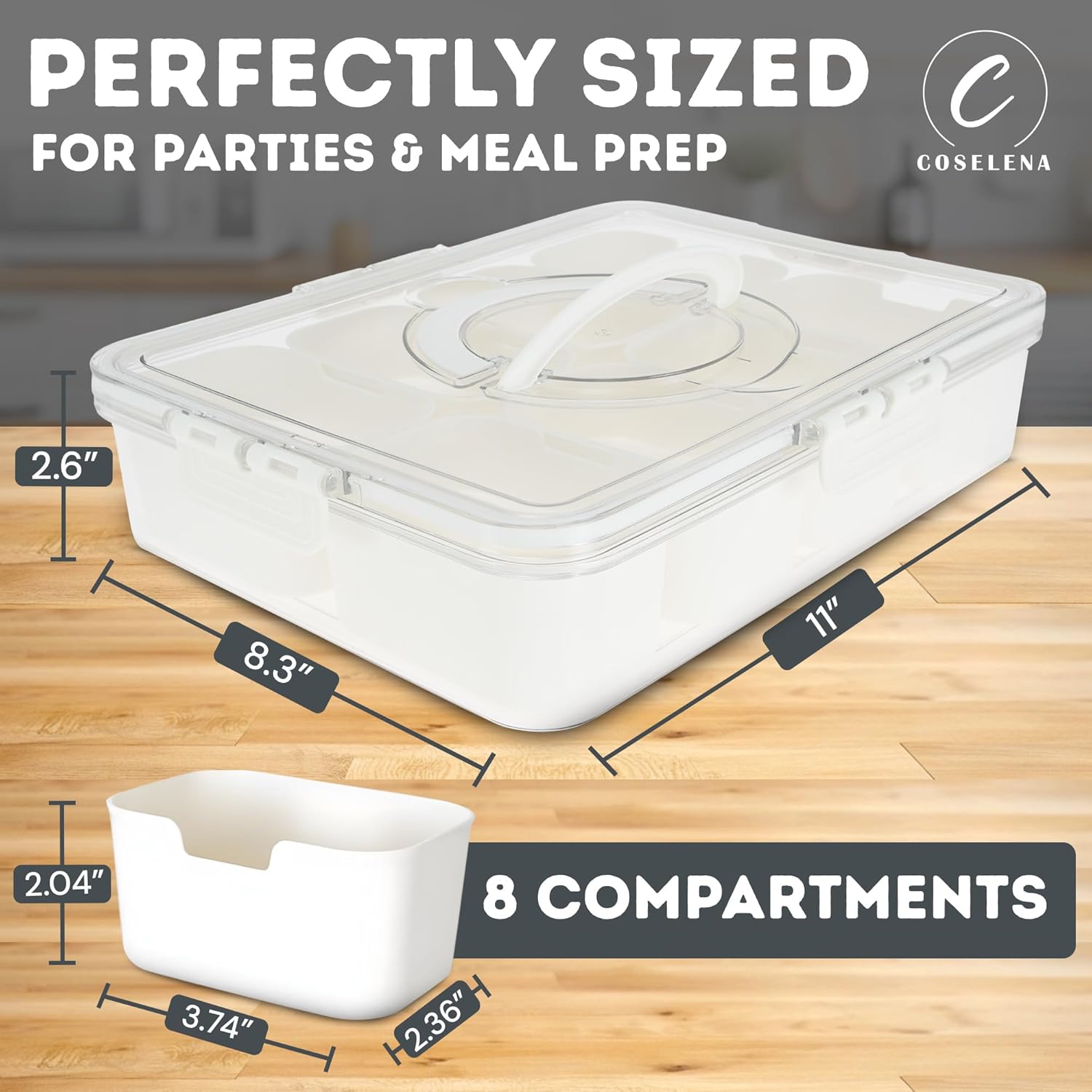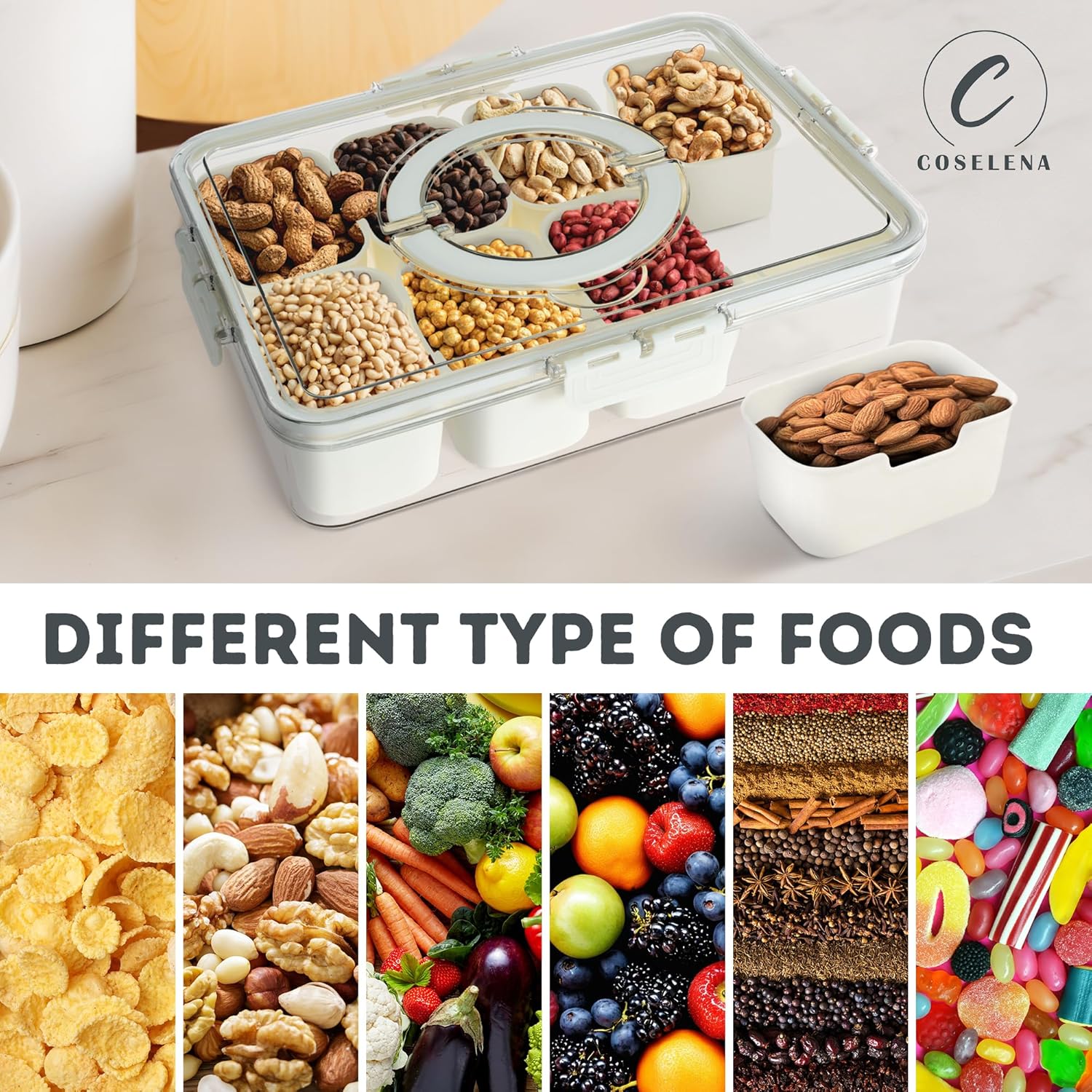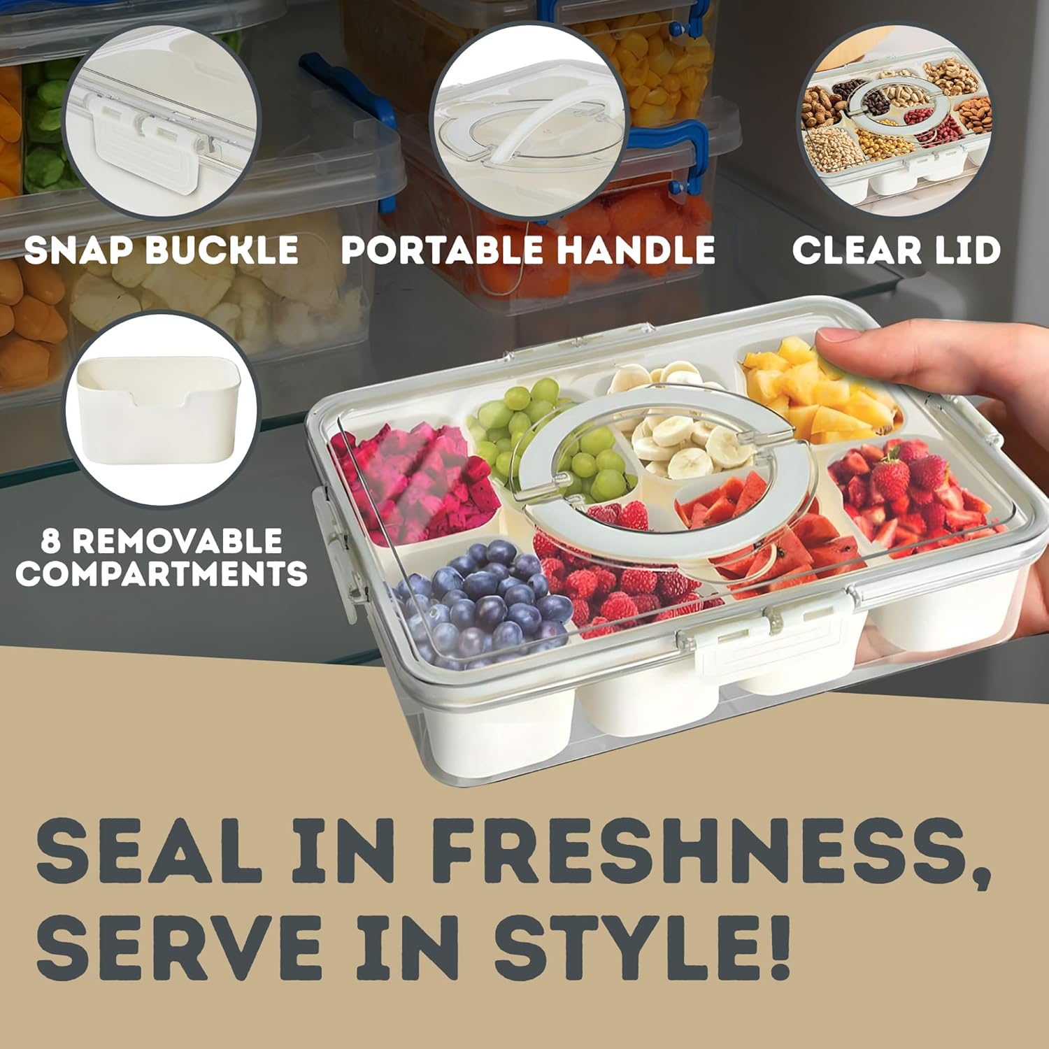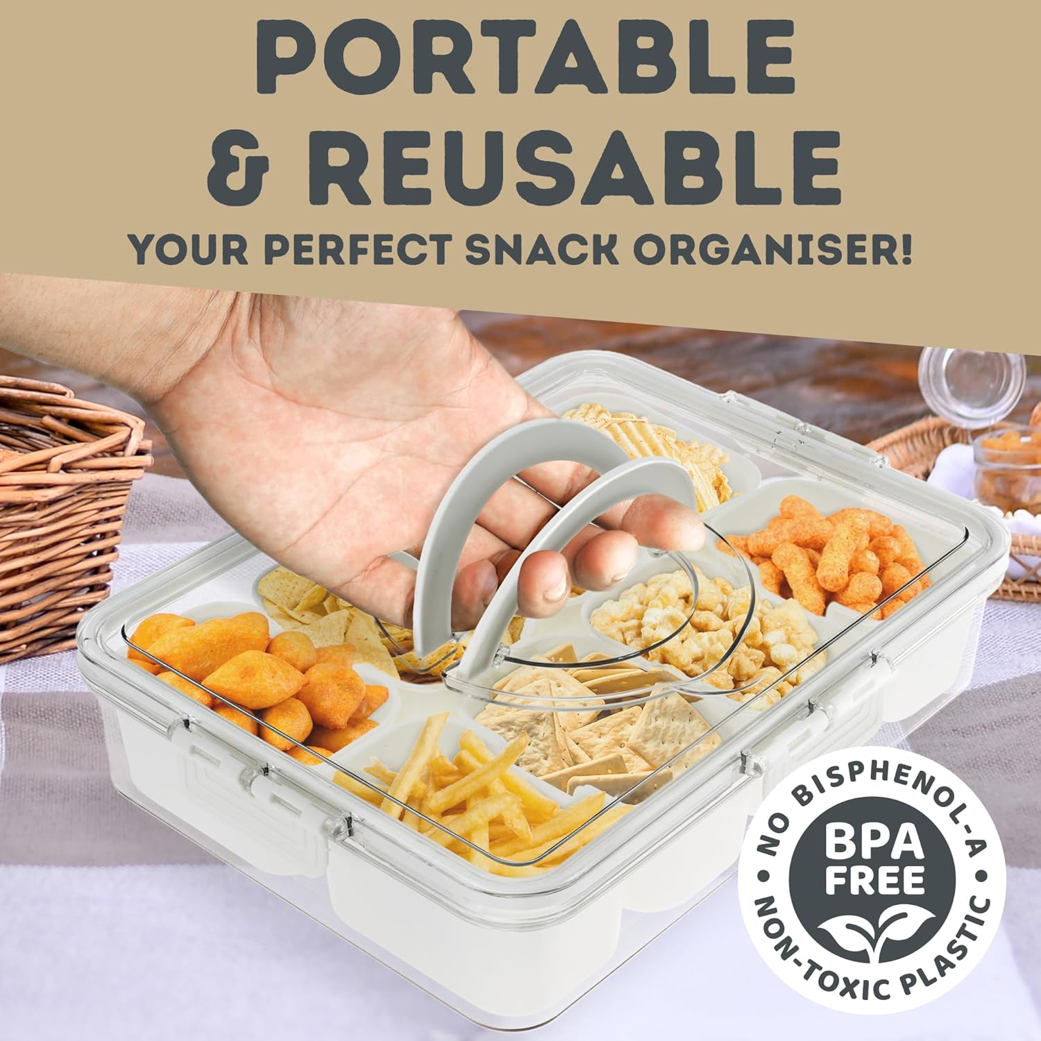 - 8 Removable Compartments – Features eight detachable compartments that are perfect for organising snacks like nuts, vegetables, biscuits, and more. You can remove the compartments to use the base tray for larger items.