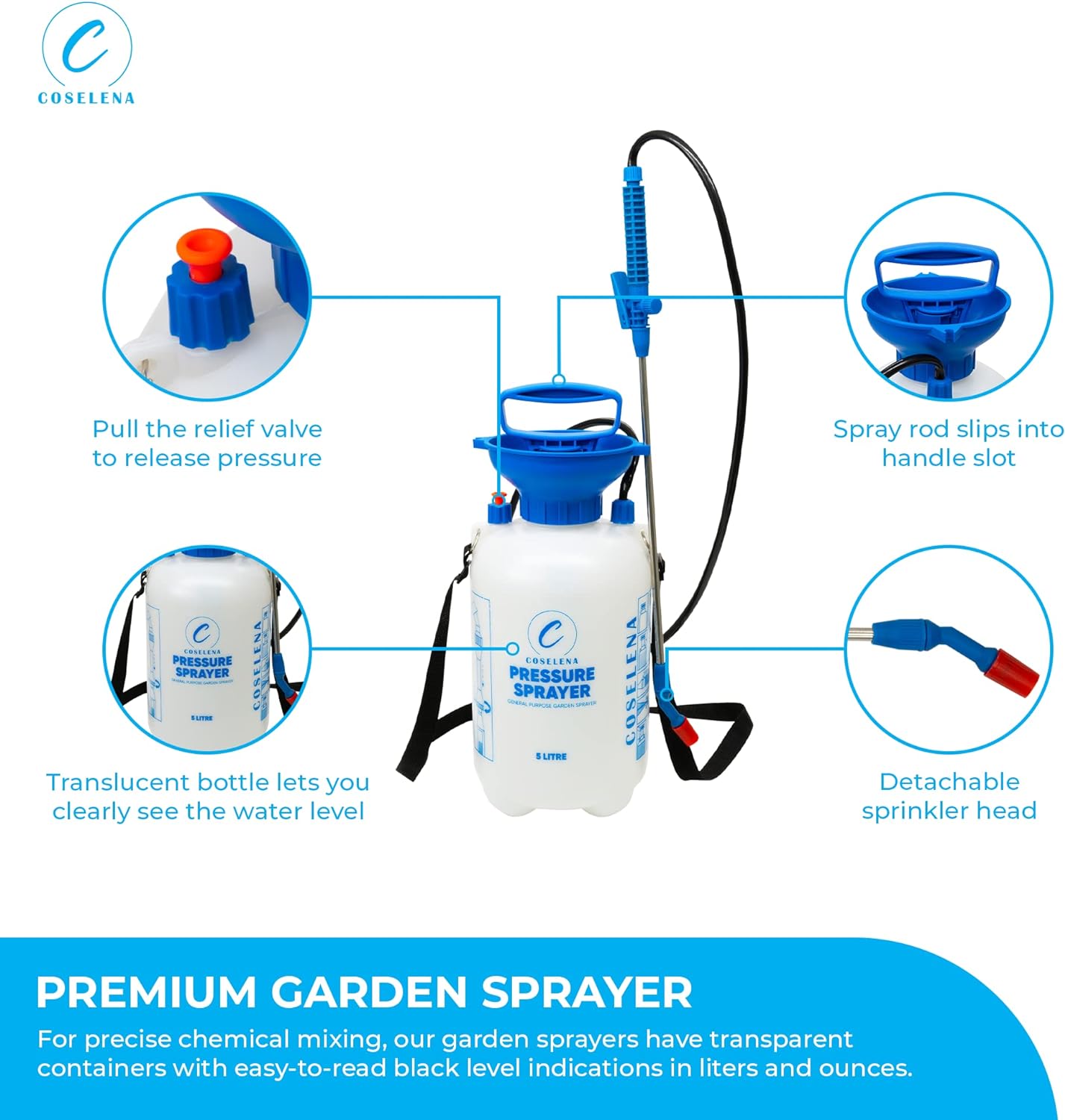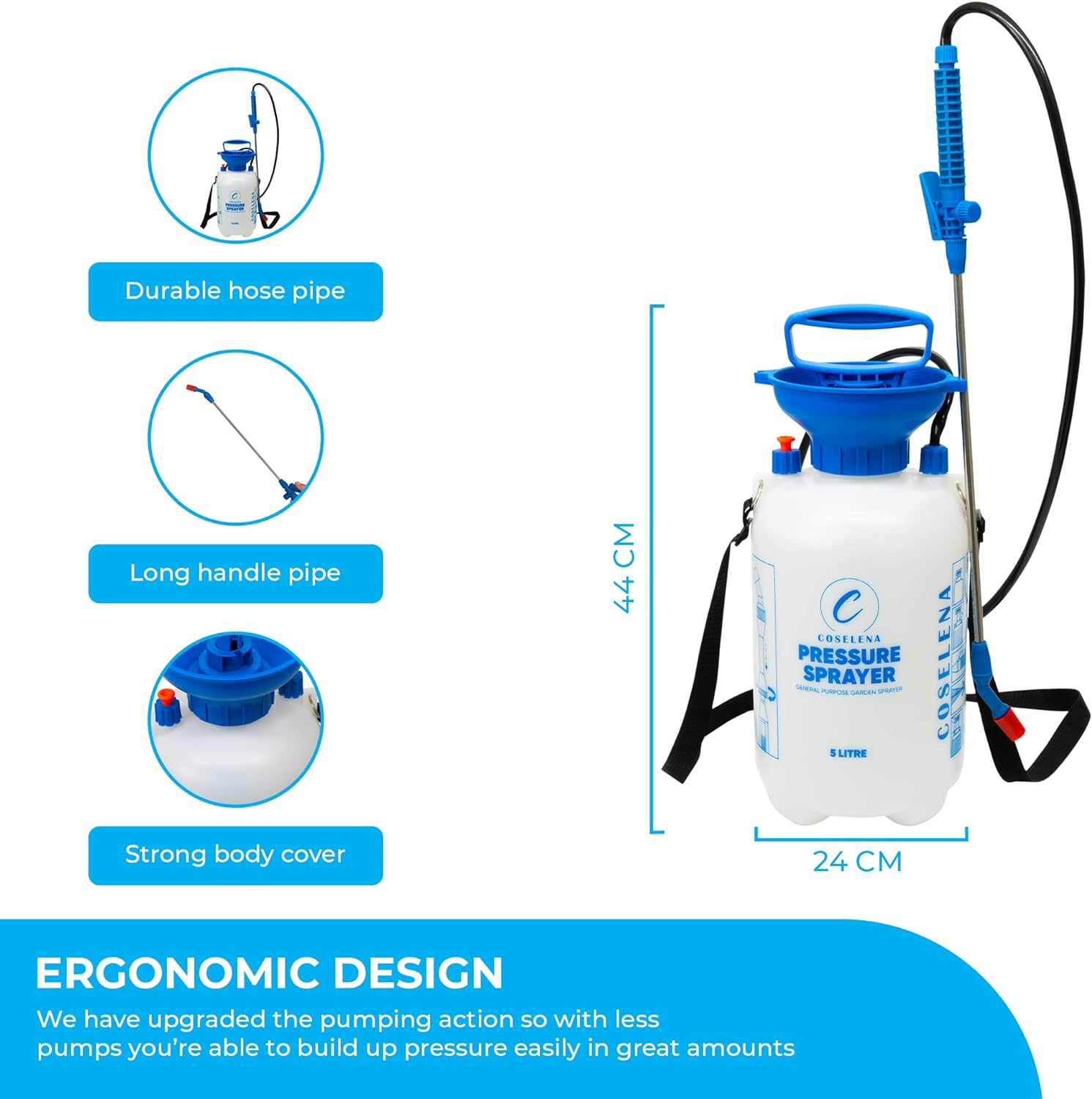 The 5-litre high-pressure sprayer comes with a powerful pump mechanism that provides consistent pressure for effective spraying. The 5-litre capacity is ideal for a range of gardening tasks. The garden spray bottle provides ample liquid storage for extended use without frequent refills.