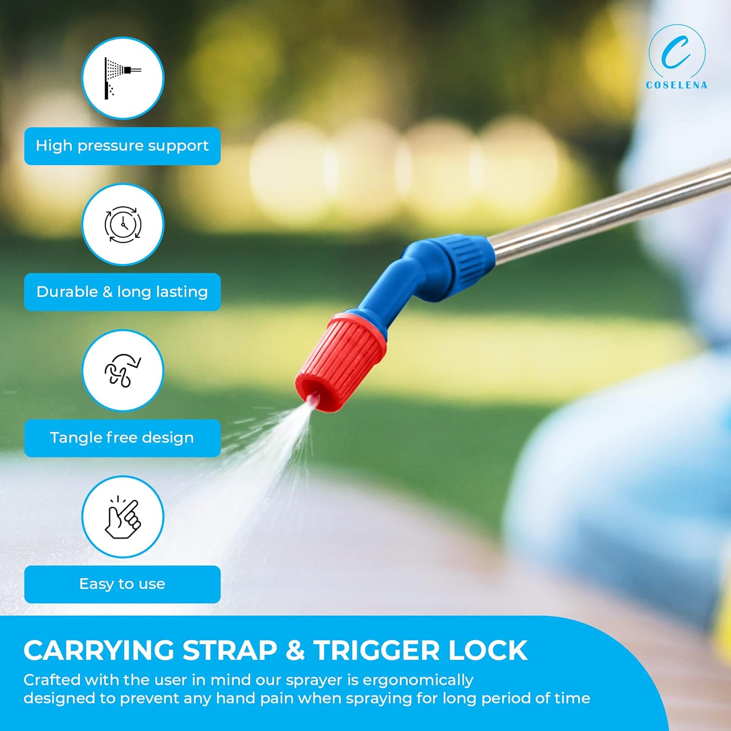 With an adjustable nozzle, the pump action pressure sprayer provides flexibility to customize your spraying pattern. This pressure sprayer 5l allows you to easily get access to any reachable area. It offers versatility for various gardening tasks. The hand pump sprayer is designed with a carrying strap for comfortable handling during use.